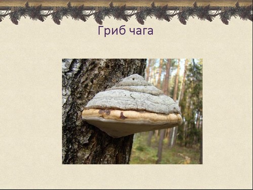 Грибы бывают большие. Например, гриб чага. (слайд 9)