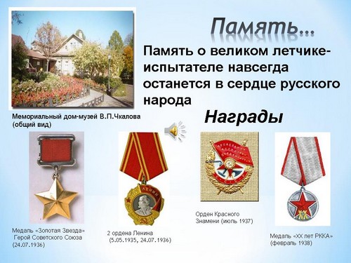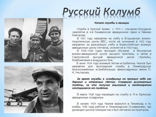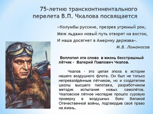 В связи с юбилейной датой (75-летие трансконтинентального перелета В.П. Чкалова) я решила отразить материалы о великом лётчике-испытателе в данной методической разработке, и донести его до сердец и душ своих детей.
