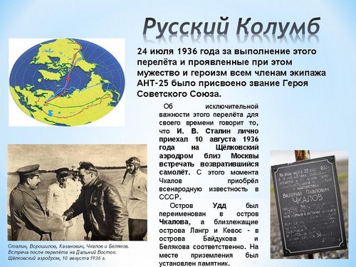 20–22 июля 1936 года экипаж АНТ-25 (В. П. Чкалов, Г. Ф. Байдуков и А. В. Беляков) совершил беспосадочный перелет через Северный Ледовитый океан из Москвы в Петропавловск-Камчатский и далее на остров Удд (ныне о. Чкалов), преодолев расстояние 9374 км за 56 часов 20 минут.