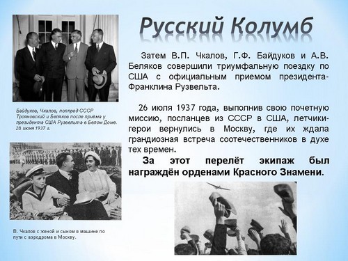 Затем В.П. Чкалов, Г.Ф. Байдуков и А.В. Беляков совершили триумфальную поездку по США с официальным приемом президента-Франклина Рузвельта.