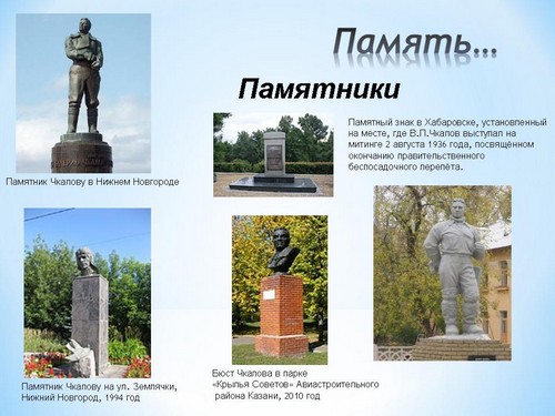 В повествовании используются: фактический материал, фотографии В.П. Чкалова в разные годы жизни, фотоматериалы увековечивающие память о герое. Презентация поможет эффективнее донести данный материал до слушателей.