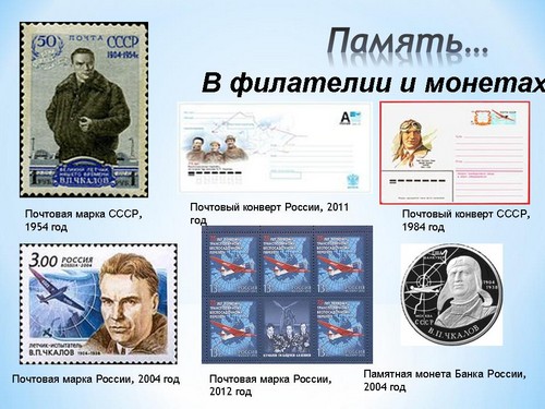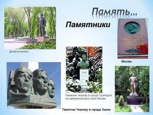 - Именем В.П. Чкалова названы населённые пункты, улицы во многих городах, суда, школы, высшее военное авиационное училище лётчиков в Оренбурге, Центральный аэроклуб в Москве, авиационные заводы в Ташкенте и Новосибирске, остров на Дальнем Востоке, улица в канадском городе Ванкувер
