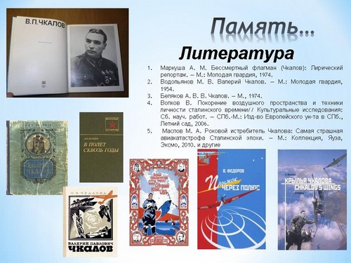 - Маркуша А. М. Бессмертный флагман (Чкалов): Лирический репортаж. — М.: Молодая гвардия, 1974.