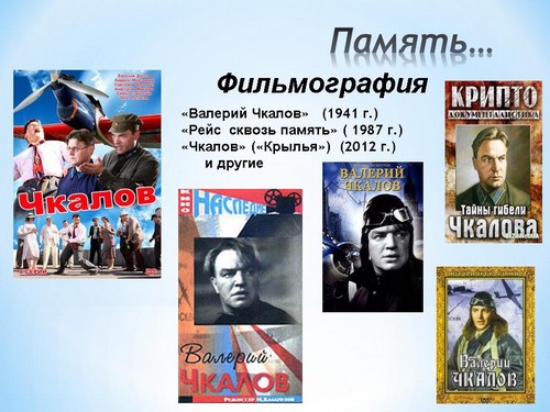 В 1941 году на киностудии им. М. Горького был создан историко-биографический фильм “Валерий Чкалов” (новая редакция выпущена в 1962).