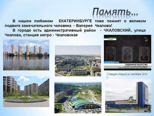 В городе есть административный район - ЧКАЛОВСКИЙ, улица Чкалова, станция метро - Чкаловская