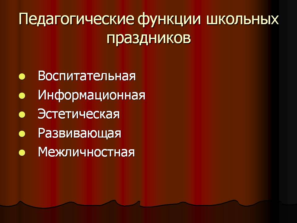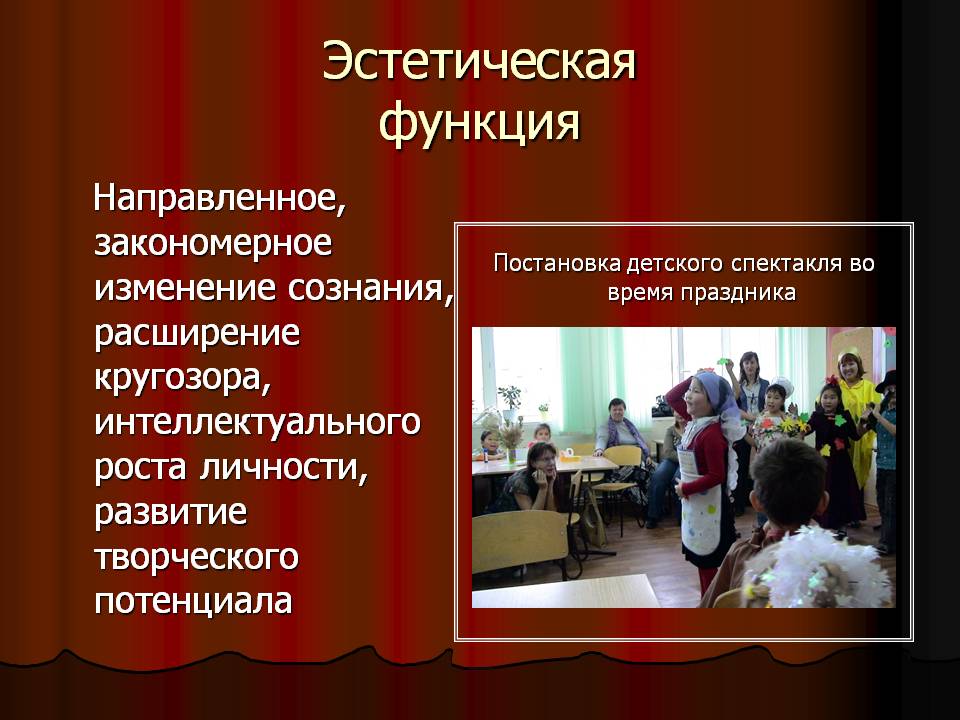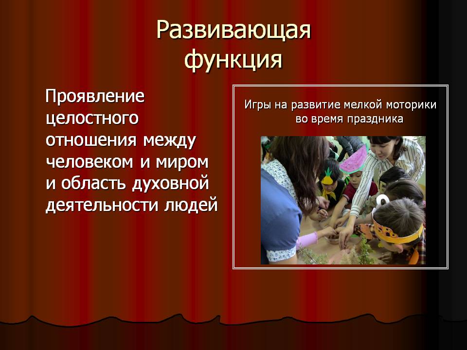 Праздник всегда выполняет важные общественные функции, имеет глубокий смысл, в нем человек ощущает себя личностью, членом коллектива. Проявление всех форм и видов культуры любого коллектива, начиная от принятых форм поведения, кончая, демонстрацией нарядов и исполнением традиционных обрядов идёт через праздник. Очевидно, что каждый праздник несёт в себе функциональную нагрузку: воспитательную; информационную; развивающую; эстетическую; межличностную.
