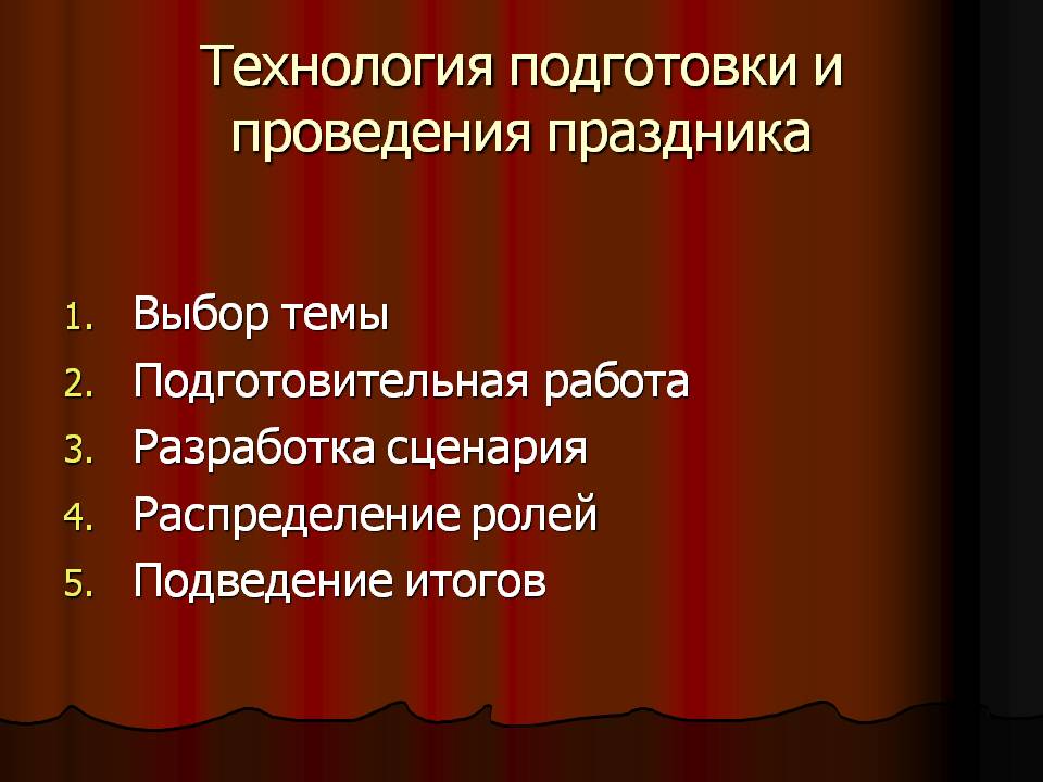 Выделим основные этапы технологии подготовки и проведения праздников: