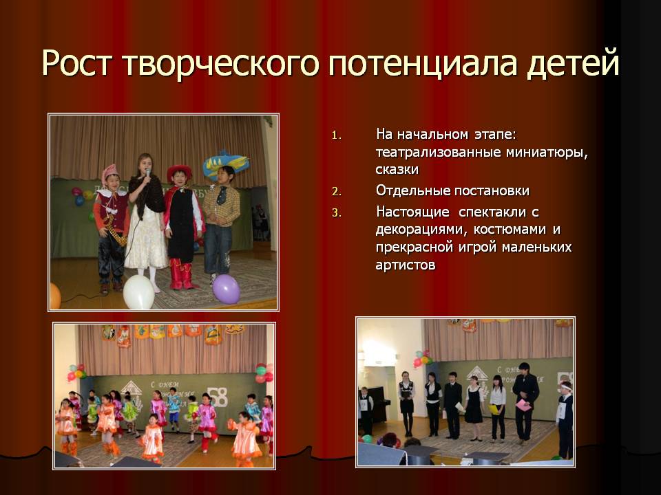 Конечно, не все дети сразу могут раскрыться, но то, что вовлечение в творческую деятельность в ходе проведения праздников развивает ребёнка – это очевидно. Примером может служить эпизод из школьной жизни. Когда заболела Таня П., исполнявшая главную роль бабушки в инсценировке стихотворения «Три мамы», посвящённый международному женскому дню «8 марта», её успешно заменила Соня Х., которая до этого не являлась активной участницей наших постановок. Народный учитель А.А. Захаренко говорил о том, что «школа – не здание, не кабинеты, не образцовая наглядная агитация. Школа – это возвышенный дух, мечта, идея, которая, увлекает сразу троих – учителя, ребёнка, родителя – и тут же реализуется. Учитель призван реализовать мечты детей» [4, с.47]. И мы в своей работе с детьми стараемся следовать этому.
