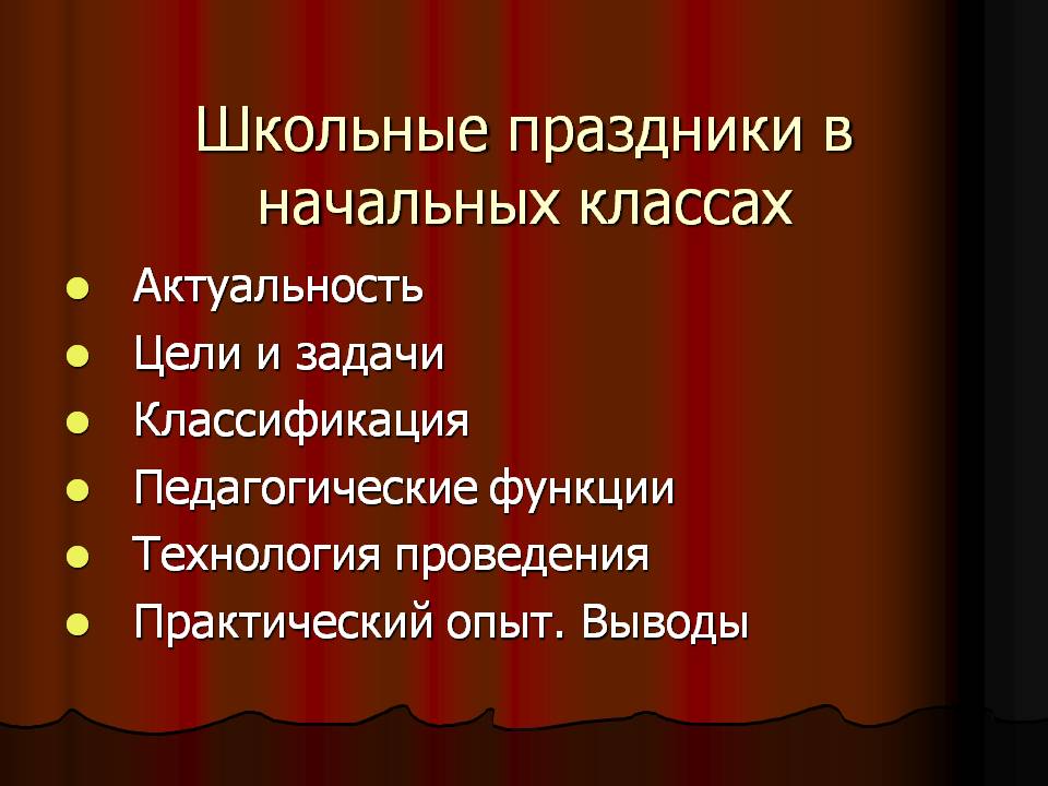 Таким образом, на основании вышеизложенного можно сделать вывод, что проведение праздничных мероприятий в процессе воспитания и обучения детей в начальной школе несёт в себе целый комплекс соответствующих функций и направлений, и способствует их реализации:
