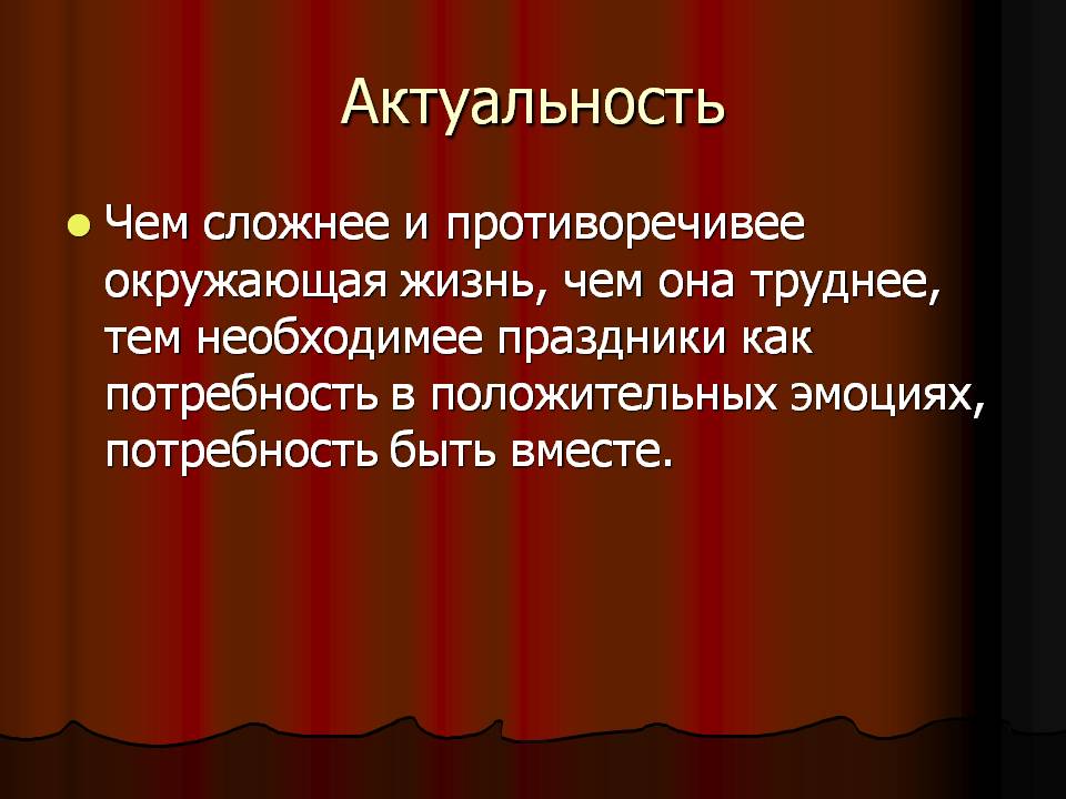 Мы живём в сложнейшее время смены исторической формации. Экономические тяготы, политические страсти, неясность политической перспективы. И вдруг – праздники! Что ж – не едиными буднями жив человек. Праздник – не праздность, это большое и важное дело, всегда коллективное и всегда творческое. Чем сложнее и противоречивее окружающая жизнь, чем она труднее и порою бесперспективнее, тем необходимее праздники как потребность в положительных эмоциях, потребность быть вместе.