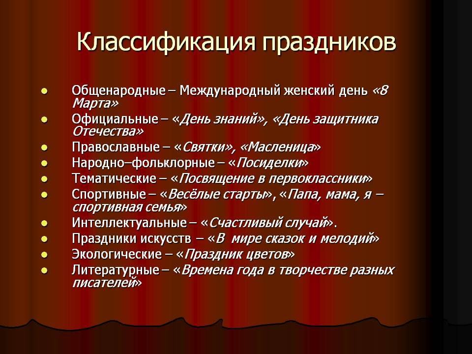 Количество и многообразие праздников знакомо не только взрослому человеку, а даже ребёнку. С первых лет жизни у него вырабатывается особое восприятие праздника или отдельной значимой для него даты. Широк диапазон праздников, находящих отражение в школьной жизни, можно выделить следующие виды праздников: