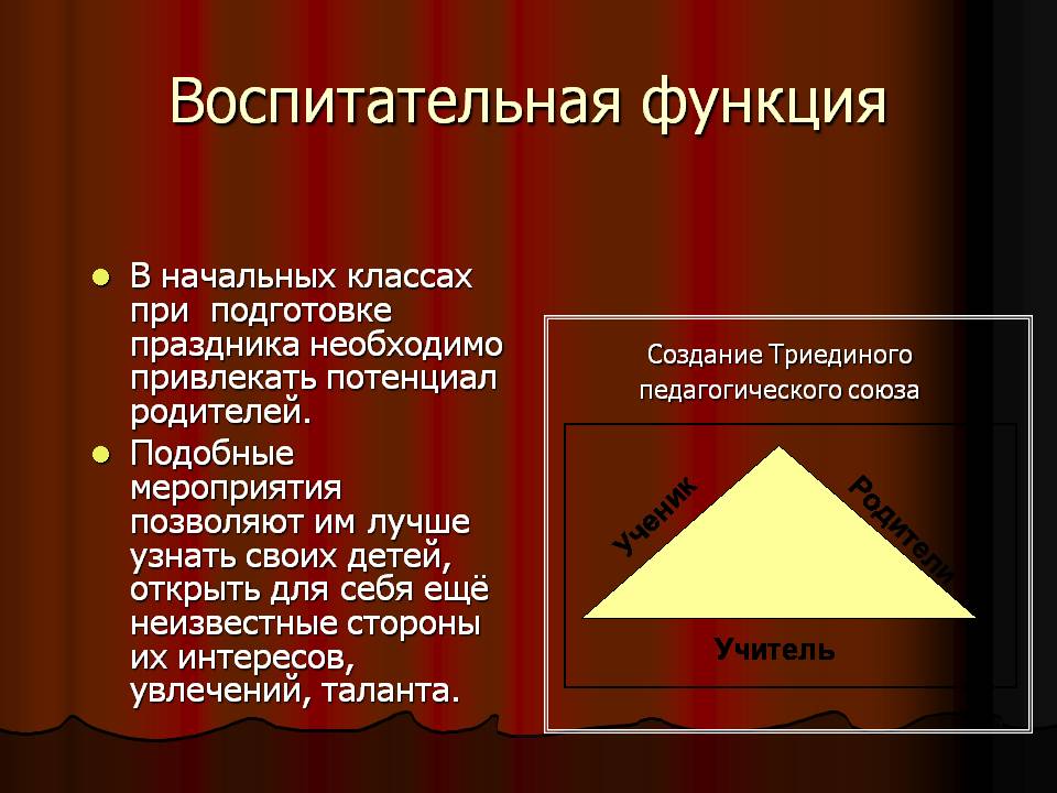 Подобные мероприятия позволяют им лучше узнать своих детей, открыть для себя ещё неизвестные стороны их интересов, увлечений, таланта; способствуют установлению партнёрских отношений семьи и школы. Дети любят праздники за новизну человеческих отношений, возможность побыть с родителями и учителями вместе как бы на равных и подольше.