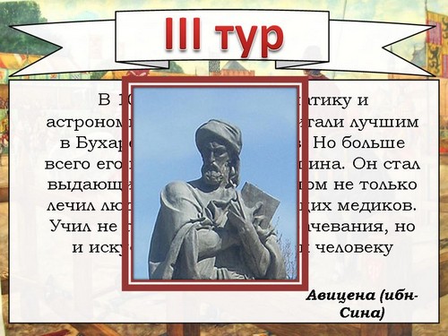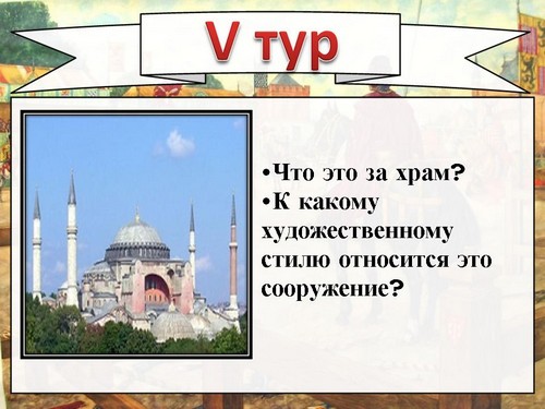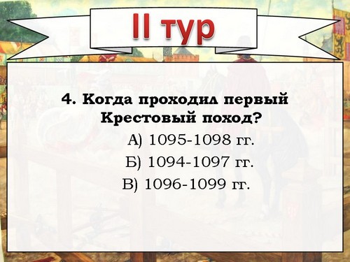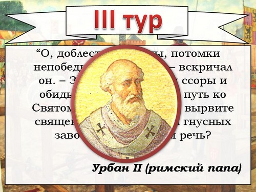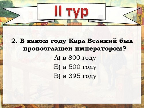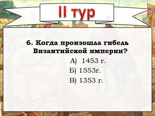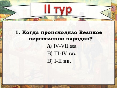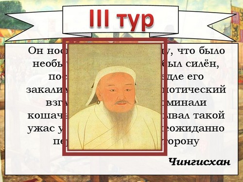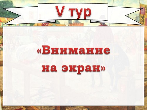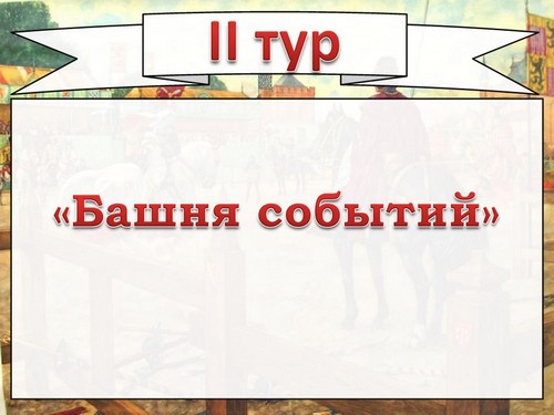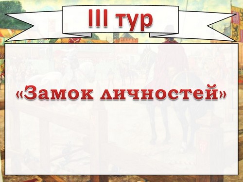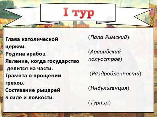 Задача этого тура – ввод конкурсантов в круг понятий, фактов, исторических личностей, которые относятся к теме игры.