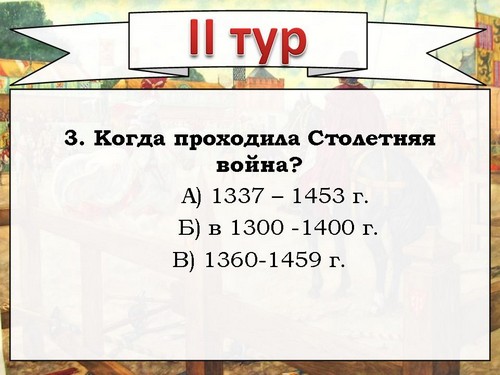 - Назовите самую длительную войну в истории. (Столетняя война)