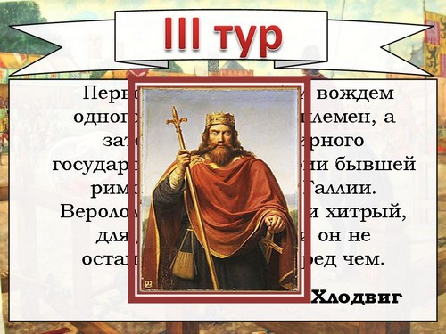 Первоначально он был вождем одного из германских племен, а затем королем обширного государства на территории бывшей римской провинции Галлии. Вероломный, коварный и хитрый, для достижения цели он не останавливался ни перед чем (Хлодвиг)
