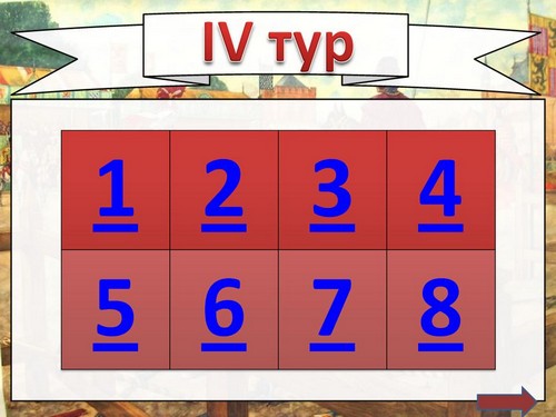 Этот конкурс построен по настоящему правилу рыцарского турнира. Каждый из членов одной команды имеет право выбрать себе противника из другой. Для этого достаточно просто назвать его имя и номер ячейки. (Слайд 19)
