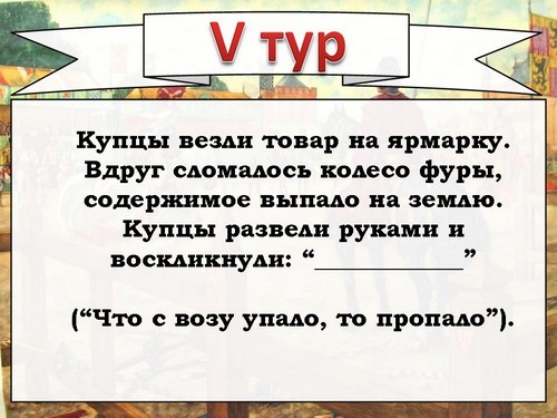 | (Слайд 33) Купцы везли товар на ярмарку. Вдруг сломалось колесо фуры, содержимое выпало на землю. Купцы развели руками и воскликнули: “____________” (“Что с возу упало, то пропало”). |