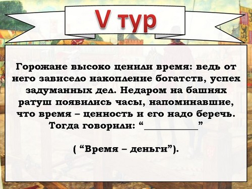 (Слайд 34) Горожане высоко ценили время: ведь от него зависело накопление богатств, успех задуманных дел. Недаром на башнях ратуш появились часы, напоминавшие, что время – ценность и его надо беречь. Тогда говорили: “___________” (“Кто умеет использовать время, тот будет господином всего, что пожелает”, или “Время – деньги”). |