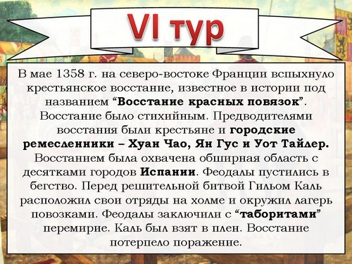 Текст: В мае 1358 г. на северо-востоке Франции вспыхнуло крестьянское восстание, известное в истории под названием “Восстание красных повязок”. Восстание было стихийным. Предводителями восстания были крестьяне и городские ремесленники – Хуан Чао, Ян Гус и Уот Тайлер.