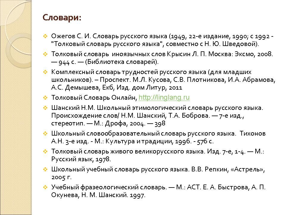 - Комплексный словарь трудностей русского языка (для младших школьников). – Проспект. М.Л. Кусова, С.В. Плотникова, И.А. Абрамова, А.С. Демышева, Екб, Изд. дом Литур, 2011