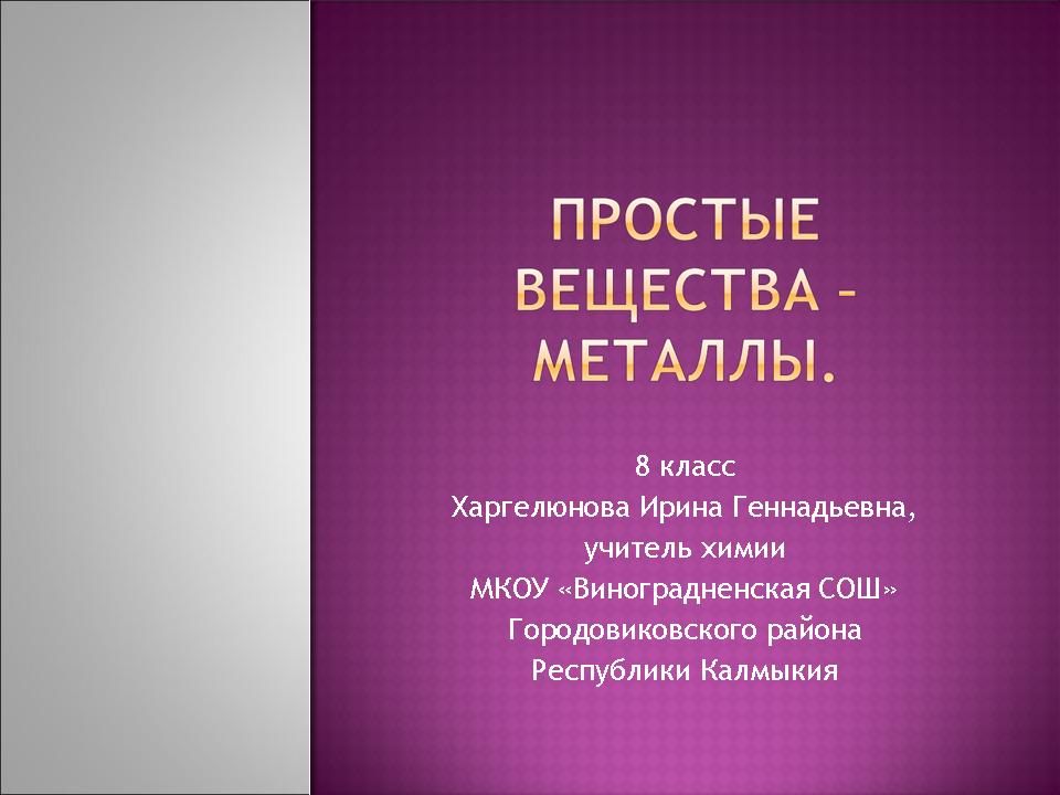 | Объявление темы урока | Правильно, тема нашего урока: “Простые вещества – металлы”. Сегодня вы узнаете о физических свойствах металлов. | ||||||||||||||||