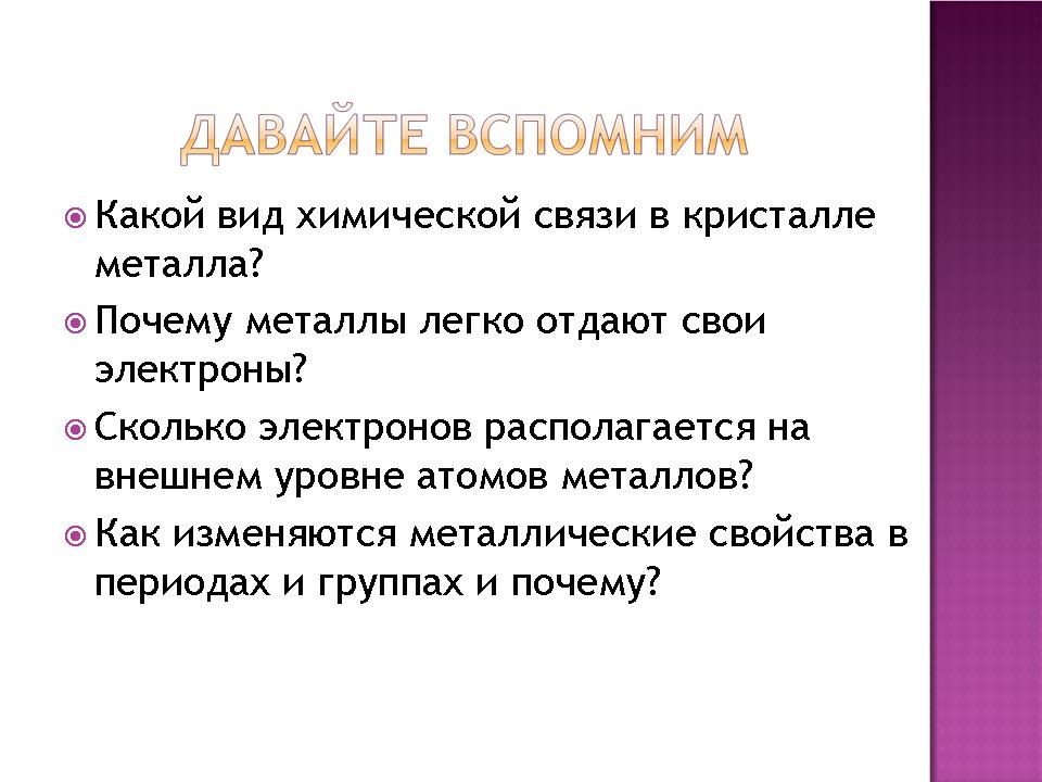 | 1. Особенности строения атомов металлов, кристаллическая решетка и химическая связь. (Беседа по вопросам) | Давайте вспомним те сведения о