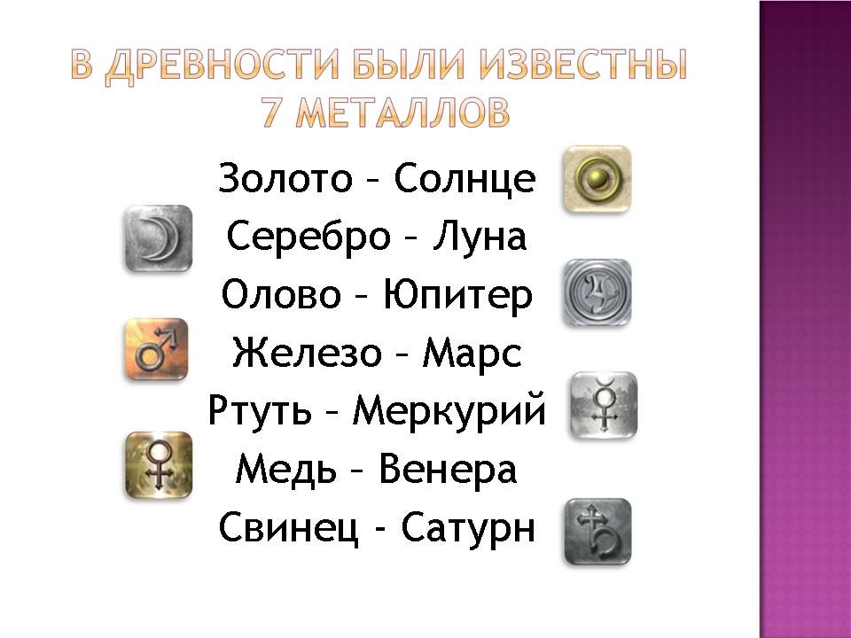 возможно, благодаря их особым свойствам. В древности и в средние века были известны только 7 металлов. Это число соотносилось с числом известных планет: Солнце (золото), Луна (серебро), Юпитер (олово), Марс (железо), Меркурий (ртуть), Сатурн (свинец), Венера (медь). Алхимики считали, что под влиянием лучей планет в недрах Земли рождаются эти металлы. |