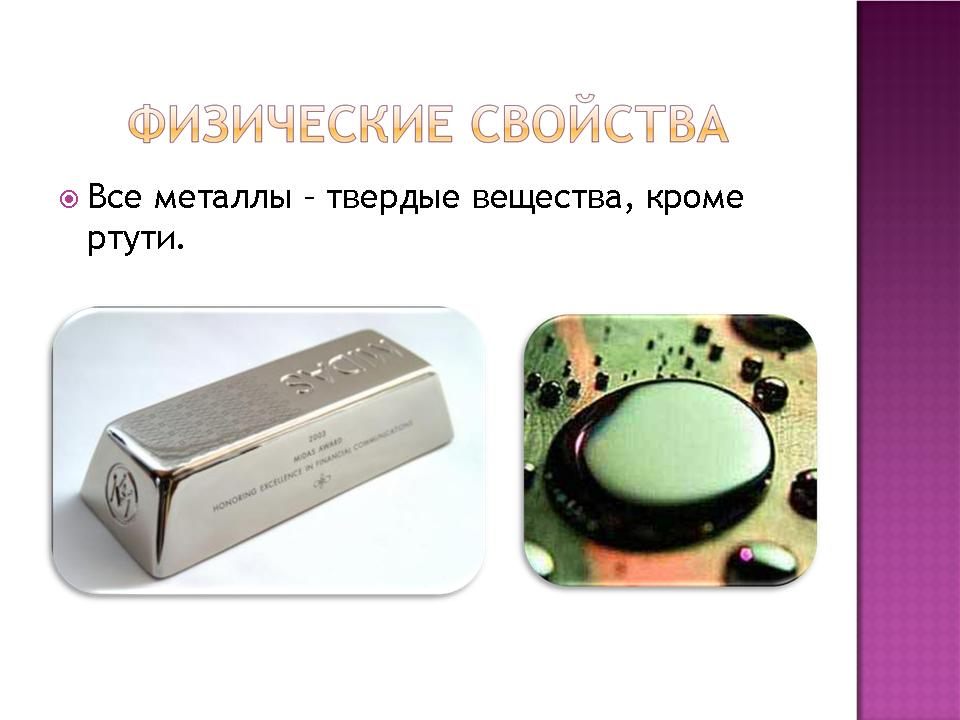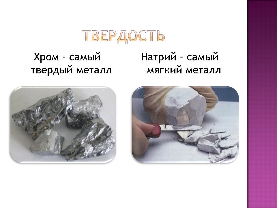 | А) твердость | Все металлы, кроме ртути Hg, твердые вещества. Самый твердый из металлов – хром Cr: он царапает стекло. Самые мягкие – щелочные металлы. | ||||||||||||||||