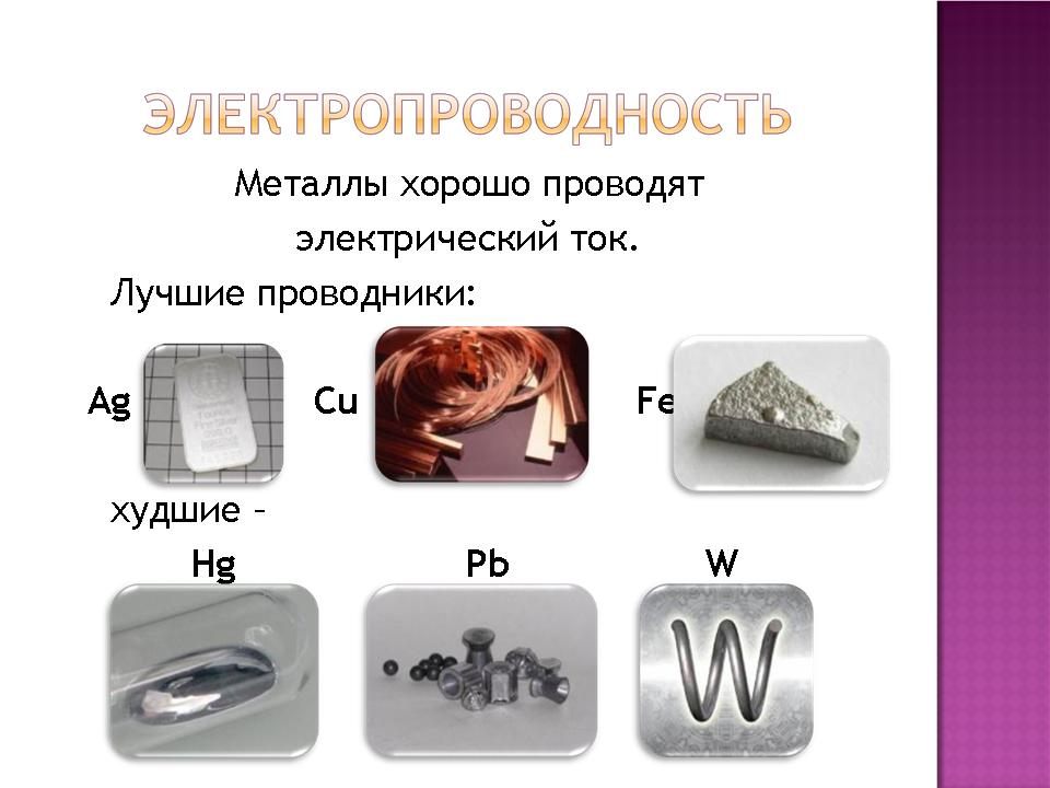 | Б) электропроводность | Металлы электро- и теплопроводны. Лучшие проводники – Ag, Cu, Fe, Al; худшие – Hg, Pb, W. | ||||||||||||||||