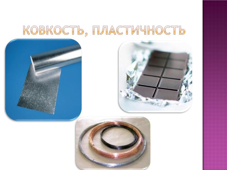 | В) ковкость, пластичность | Металлы легко подвергаются ковке, прокатываются в тонкие листы и вытягиваются в проволоку. Алюминиевая фольга появилась сравнительно недавно и раньше чай, шоколад паковали в фольгу из олова, которая называлась станиолью. | ||||||||||||||||