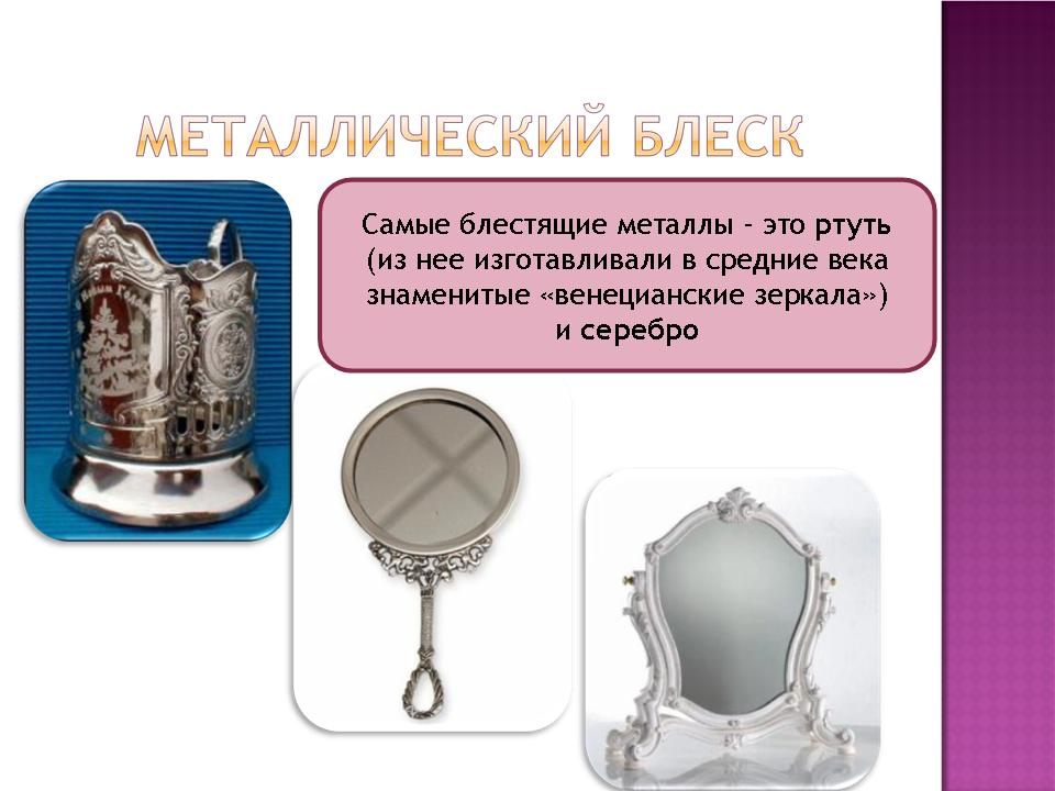 | Г) металлический блеск | Металлический блеск, который в порошке теряют все металлы, кроме Al и Mg. Самые блестящие металлы - это Hg (из нее изготавливали в средние века знаменитые “венецианские зеркала”), Ag (в древние времена использовали отполированные серебряные пластины, которые отражали все черточки лица и хорошо сохранялись. Теперь же с помощью реакции “серебряного зеркала” изготавливают современные зеркала) | ||||||||||||||||
