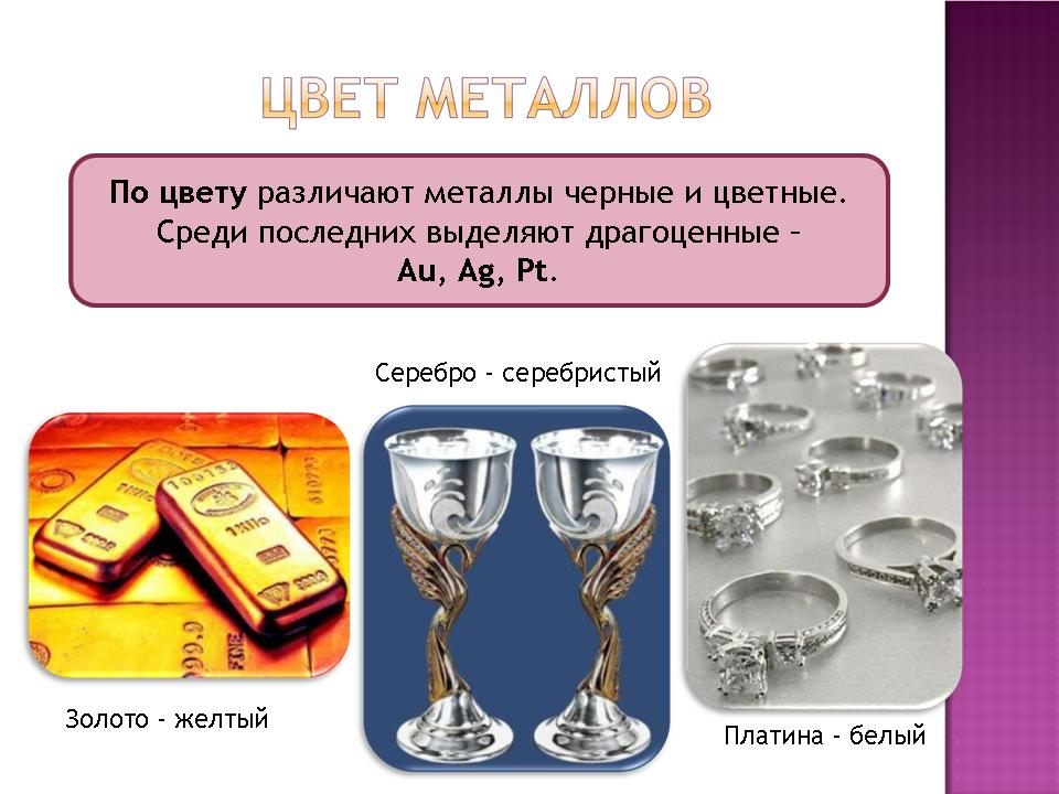 | Е) цвет металлов | По цвету различают металлы черные и цветные. Среди последних выделяют драгоценные - Au, Ag, Pt. Золото – металл ювелиров. Именно на его основе изготовляли знаменитые пасхальные яйца Фаберже | ||||||||||||||||