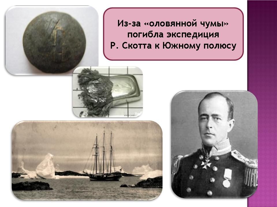 в ящиках прибыл мелкий серый порошок. За четыре года до этого произошла катастрофа с экспедицией Р. Скотта. Экспедиция, направлявшаяся к Южному полюсу, погибла, так как осталась без топлива. Оно вытекло из железных сосудов сквозь швы, пропаянные оловом. Этот секрет открыл русский ученый В.В. Марковников. Оказывается, при температуре ниже 13,2оС в кристаллической решетке олова начинается перестройка. Белое олово превращается в порошкообразное серое и чем ниже температура, тем больше скорость этого превращения. Результат этого превращения называют “оловянной чумой”, из-за пятен и наростов, которые образуются на оловянных изделиях. |