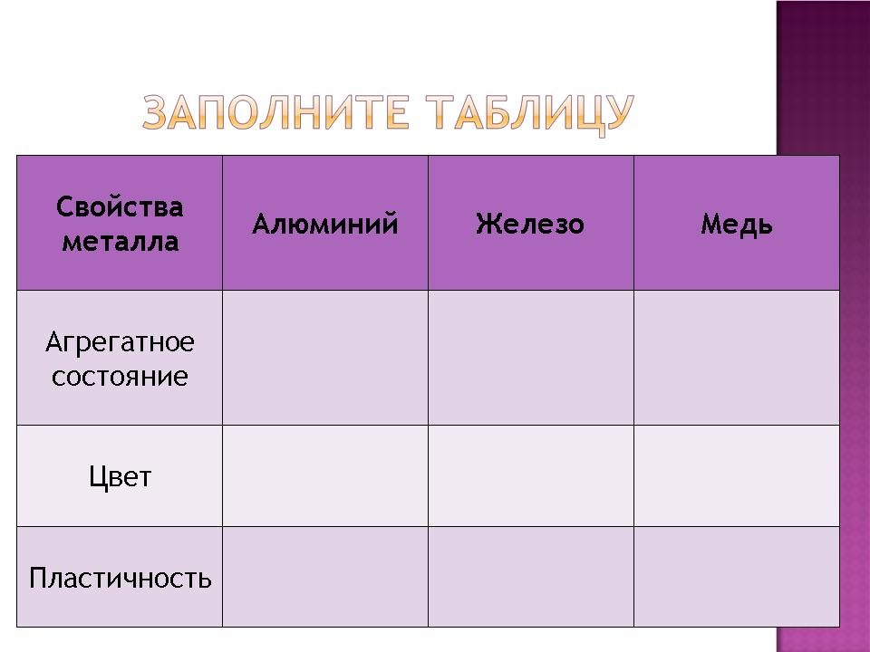 Каждый ряд работает с одним металлом: 1 ряд – алюминий, 2 ряд – железо, 3 ряд – медь. Инструкция: 1.Рассмотрите образец металла и определите его агрегатное состояние. 2. Определите цвет металла. 3. Определите пластичность металла, для этого попробуйте согнуть пластину металла. 4. Заполните таблицу: