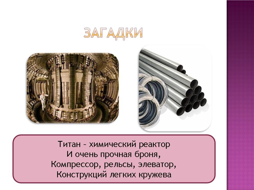 | Титан – химический реактор И очень прочная броня, Компрессор, рельсы, элеватор, Конструкций легких кружева. (прочность, пластичность) |
