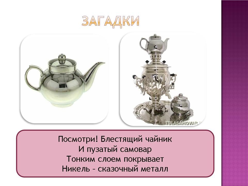 | Посмотри! Блестящий чайник И пузатый самовар Тонким слоем покрывает Никель – сказочный металл. (металлический блеск) |