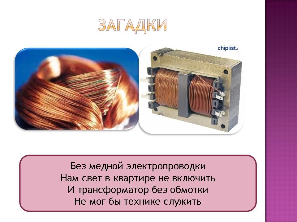 | Без медной электропроводки Нам свет в квартире не включить И трансформатор без обмотки Не мог бы технике служить. (электропроводность) |