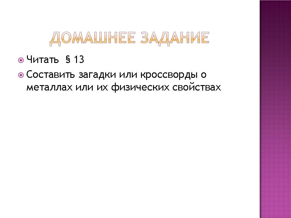| Просмотр флеш-анимации | Физические свойства металлов: пластичность. http://school-collection.edu.ru/catalog/res/0ab63254-4185-11db-b0de-0800200c9a66/view/ | ||||||||||||||||