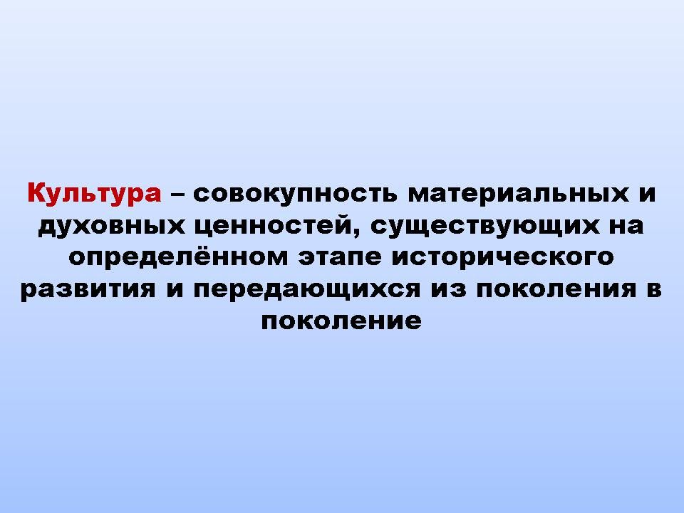 Культура – совокупность материальных и духовных ценностей, существующих на определённом этапе исторического развития и передающихся из поколения в поколение