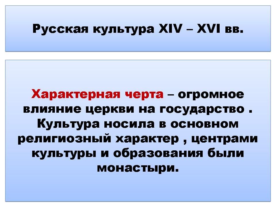 - Характерная черта – огромное влияние церкви на государство . Культура носила в основном религиозный характер , центрами культуры и образования были монастыри.