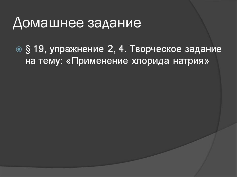§ 19, упражнение 2, 4. Творческое задание на тему: «Применение хлорида натрия» (слайд 11)