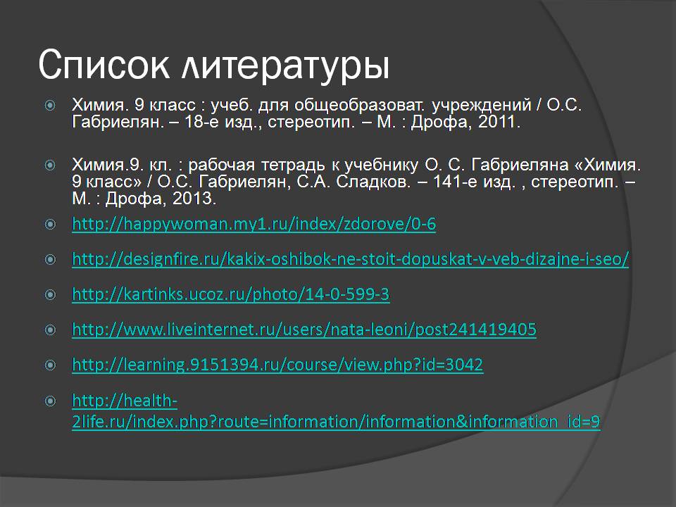 - Химия. 9 класс : учеб. для общеобразоват. учреждений / О.С. Габриелян. – 18-е изд., стереотип. – М. : Дрофа, 2011.