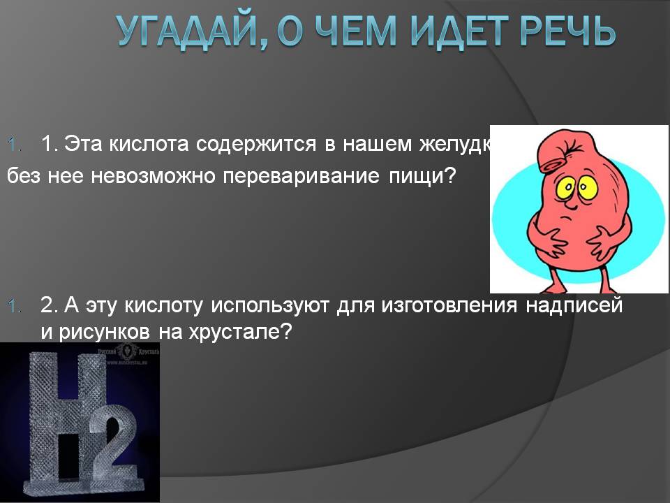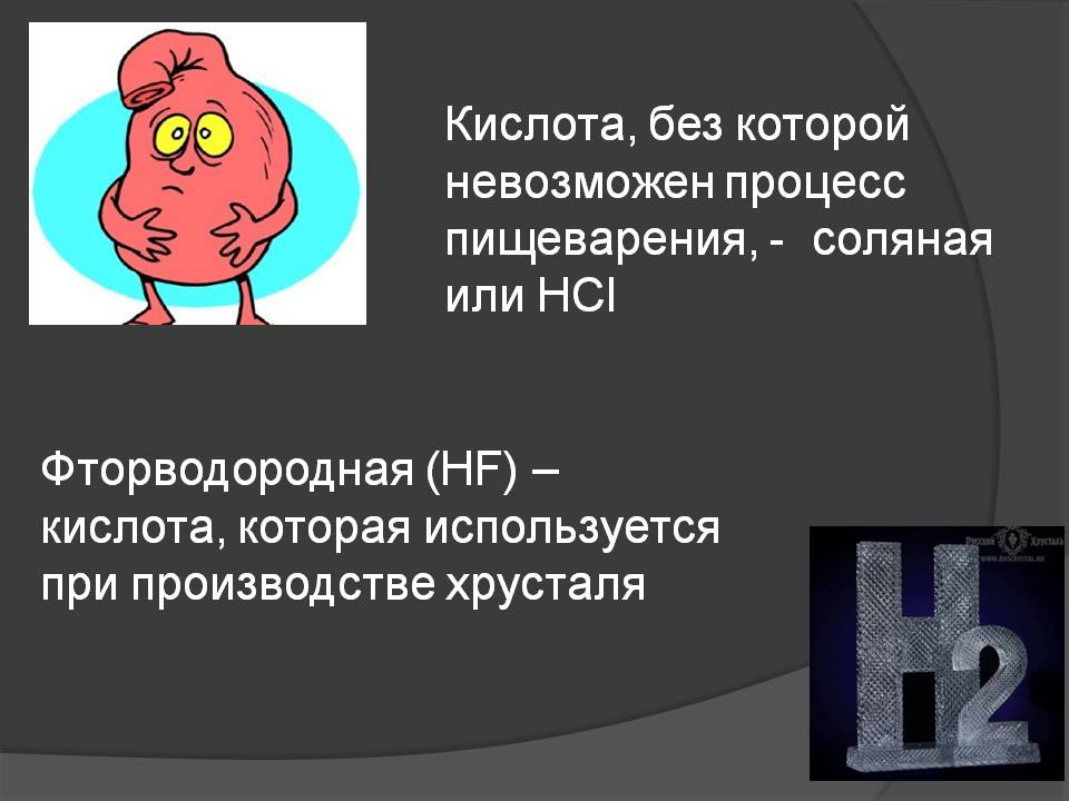 - А эту кислоту используют для изготовления надписей и рисунков на хрустале? (плавиковая)(слайд 2, 3 )