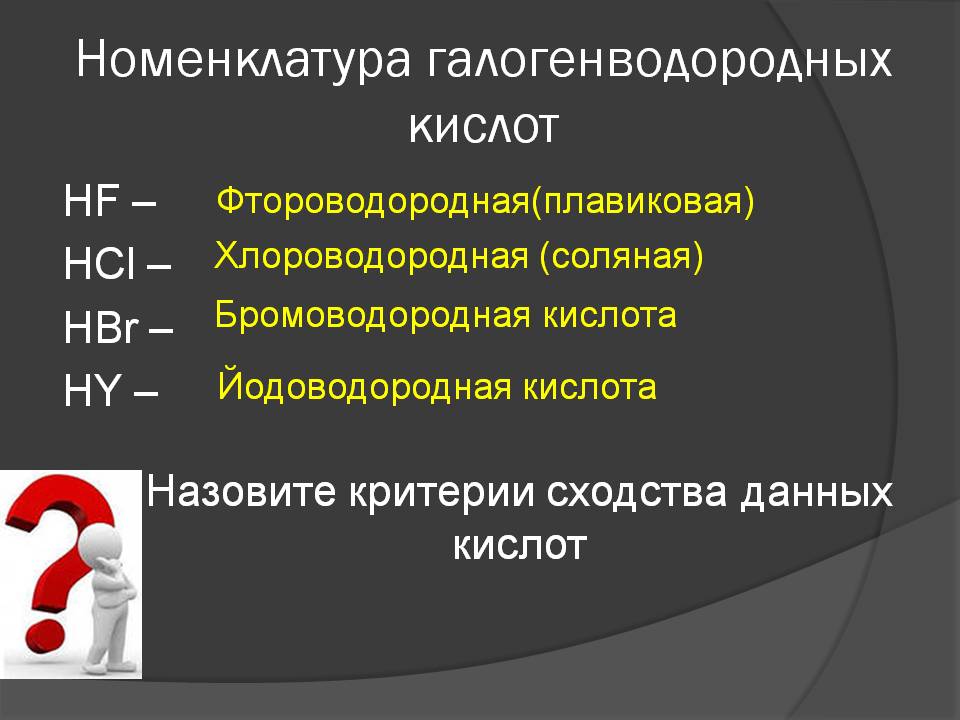 Итак, мы выяснили, что при растворении в воде, газообразные галогеноводороды образуют…что? Давайте соотнесем названия кислот с формулами галогеноводородов. (слайд 4)