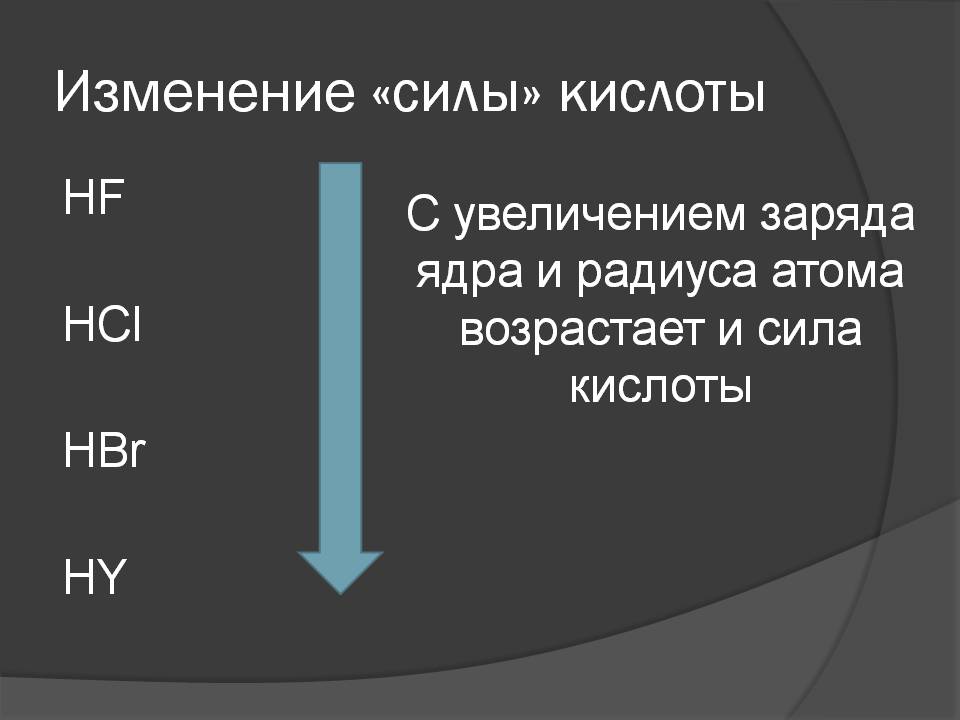 HF Расположены в 7 А группе, но с ростом заряда и периода растет радиус и, следовательно, сила кислоты