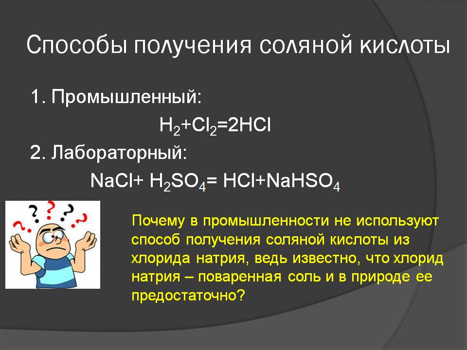 Подумайте, пожалуйста, и определите из ряда кислот, какая является наиболее технически важной? Изучив текстовую информацию на стр. 111 и рассмотрев внетекстовый компонент 52, сформулируйте 2 основных способа получения соляной кислоты (слайд 6)