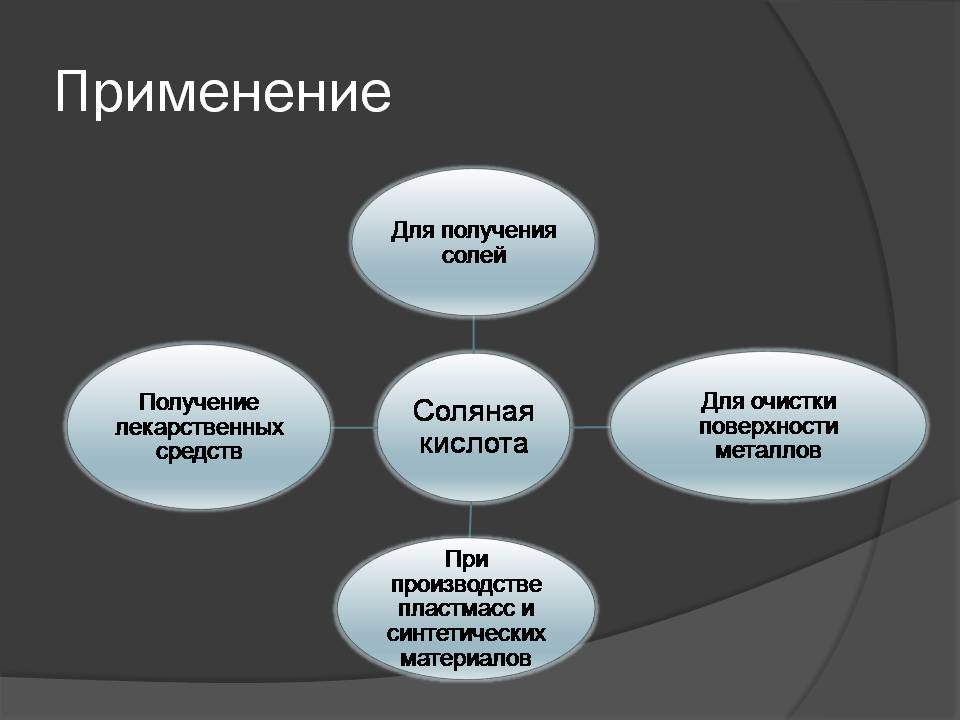 Вот смотрите, мы изучили физические свойства, химические свойства, качественные реакции, получения соляной кислоты. И у меня возник вопрос, а для чего вообще мы все это изучаем? Где нам могут пригодиться знания о соляной кислоте? Давайте заполним схему применения соляной кислоты (слайд 9)