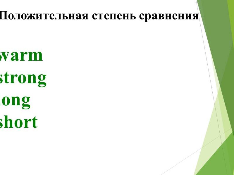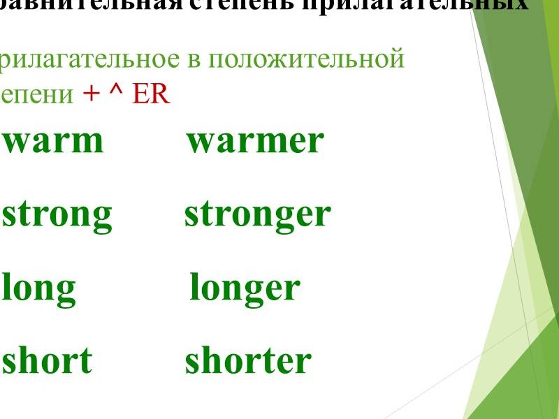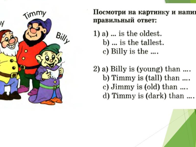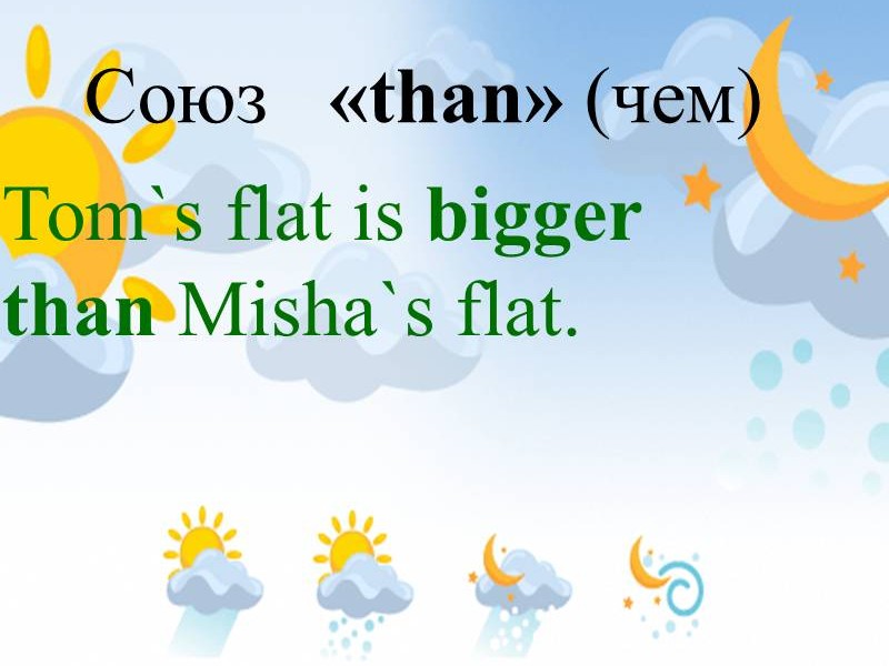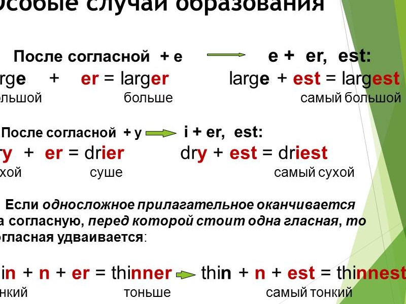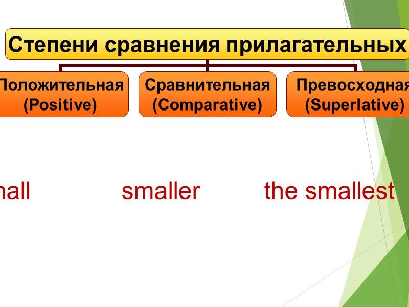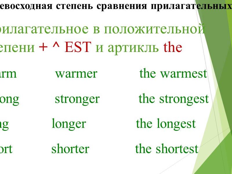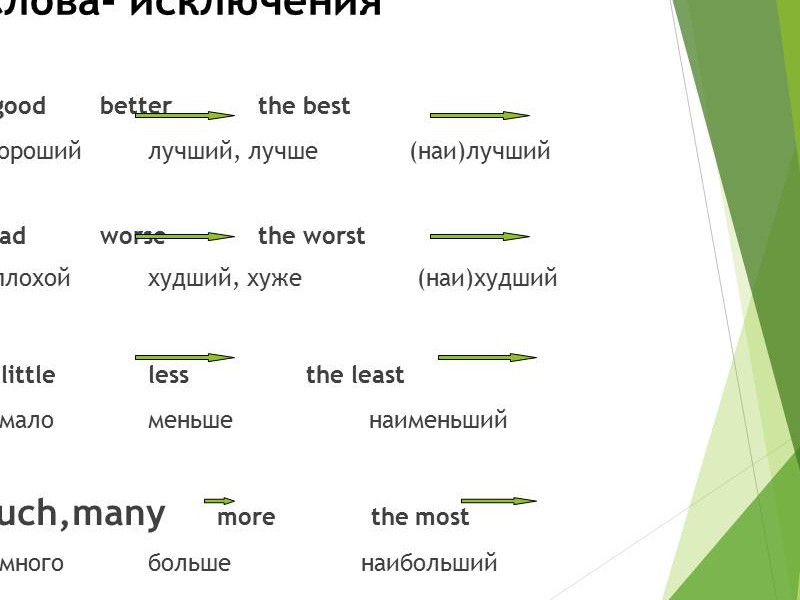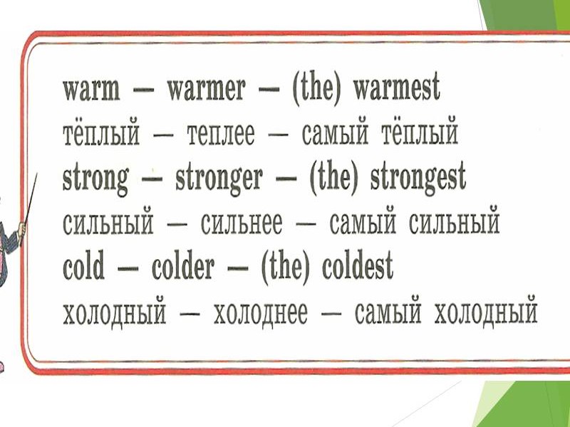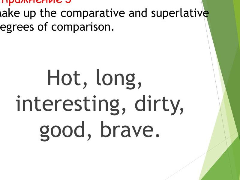 | Слайд №4 Прочитайте и переведите прилагательные, которые имеют сравнительную степень. Запишите одно из прилагательных в сравнительной степени в тетрадь. Слайд №5 Прочитайте и переведите прилагательные, которые имеют превосходную степень. Запишите одно из прилагательных в превосходной степени в тетрадь. Слайд №6 Read after me Обратите внимание на произношение суффиксов. Слайд №7-8 Посмотрите на слайд и ответьте на вопрос: какие особенности при образовании сравнительной и превосходной степени существуют? Сделайте краткую запись в тетрадях. Слайд №9 Есть слова-исключения. Read after me. Запишите в тетрадь. Слайд №10 Посмотрите на слайд и ответьте на вопросы: какой союз употребляется, когда сравнивают предметы или лица? Прочитайте и переведите. |