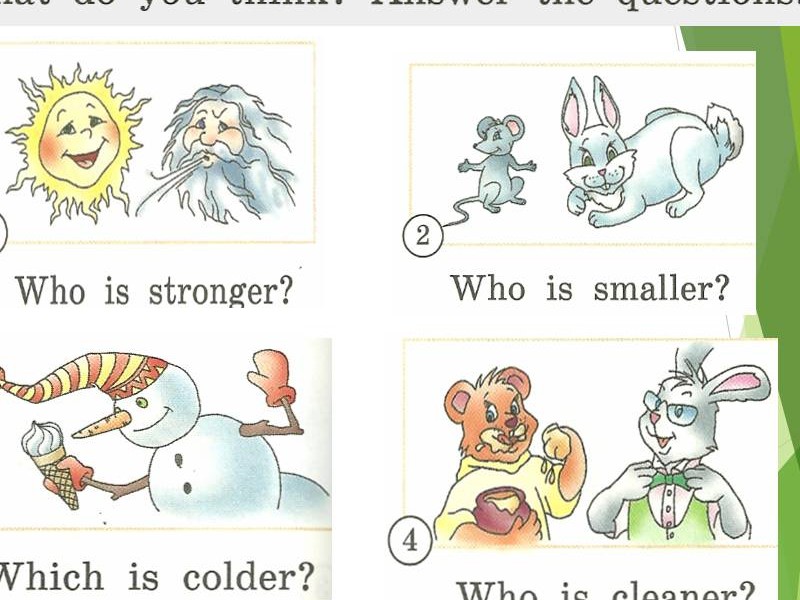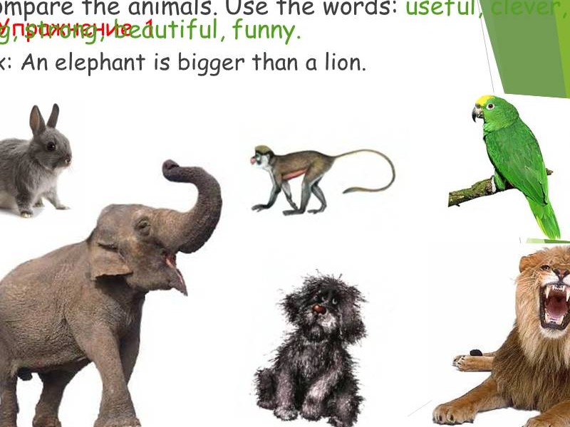 закрепление, предложенные на слайдах. Слайд №15 What do you think? Answer the questions. Слайд №16 Complete the sentences. Слайд №17 Compare the animals. Use the words: useful, clever, big, strong, beautiful, funny. Ex: An elephant is bigger than a lion. Слайд №18 Посмотри на картинку, сравни и напиши правильный ответ. |