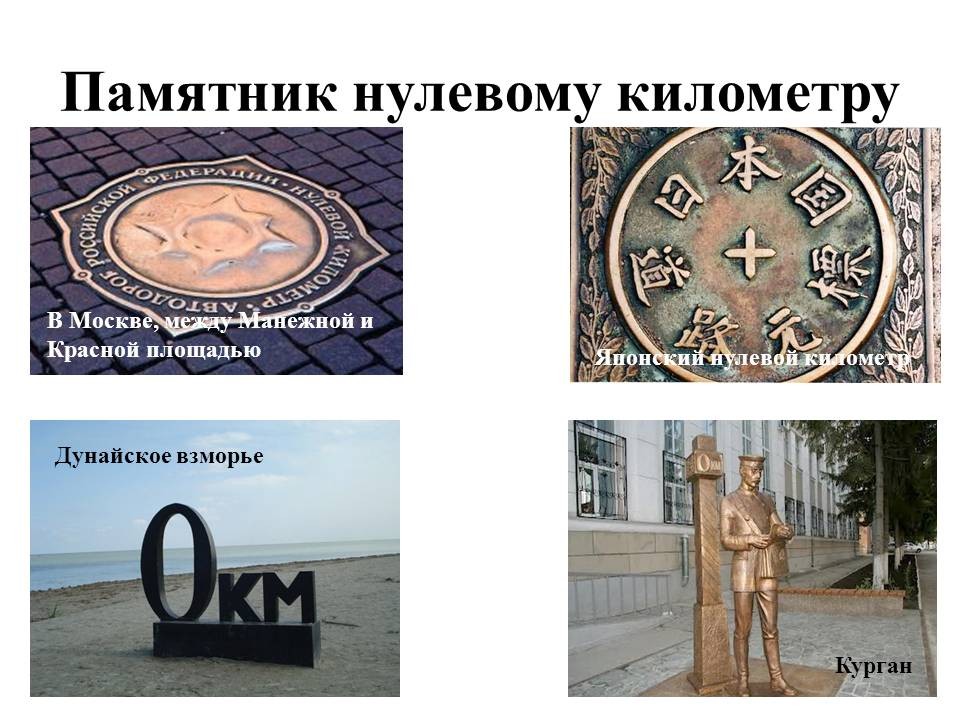 находятся в различных частях мира. Первый памятник “Нулевому километру”. Многие города мира отмечают точку отсчёта расстояний автодорог особым знаком – “нулевым километром”. Вот некоторые из них. |